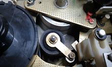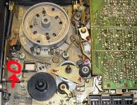 Ach ja, links vom Kassettenantrieb ( das Teil, das von unten in die Cassette rein ragt und die beiden Spulen, oben / unten bewegt ) gibt es ein Hebelchen von einem Magnetschalter bewegt. Das ist vermutlich eine Bremse. Drückt gegen den unteren Teil des erwähnten Kassettenantriebs. Da war der Bremsgummi Propfen weich und schleimig. Den hatte ich durch ein zugeschnittenes Gummistückchen ersetzt.