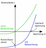 Verstehe es nicht zu 100%. Erinnere mich dunkel, dass der "Erzeugerstrom" einer Quelle negativ ist. Ist aber auch egal. Ohne Beleuchtung hat der Strom eine andere Richtung als der Kurzschlussstrom (mit Beleuchtung). Auch geht die Kennlinie ohne Beleuchtung durch 0V-0A durch, das ist für mich keine Diode. Die Klemmspannung einer Batterie ist jedenfalls größer.