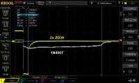 Man erkennt schön, wie die Magnetisierung mit den ZD39 nach rund 3 ms mit ca. -40 V zusammenbricht. Bei der 1N4007-Lösung dauert es rund 42 ms bei ca. -1 V, also 14x länger.