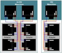 Ditschy hat ein 18 Volt Gerät, möchte einen Adapter haben / bauen mit 2 Akkus 18 Volt, in Parallelschaltung. Spannung bleibt dann bei 18 Volt, Ampere addieren sich, für längere Laufzeit
