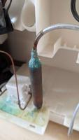 Das grüne ist Kupferoxid von außen, schau mal im KT innen die Plasterückwand ob die sich nach innen gewölbt hat, bzw wenn man draufdrückt, ob die sich nach hinten drücken läßt, die gasen dort aus, am Übergang des ehemaligen Expansionsventils wo jetzt nur noch eine gepfropfte Einspritzdüse ist.