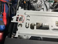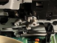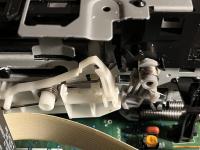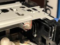 Was ich allerdings absolut nirgends gefunden habe, ist der entscheidende Trick, wie man überhaupt an die Schrauben kommt, die das Laufwerk von oben halten. Im Ruhezustand sind die nämlich von der Grundplatte des Kassettenschachtes verdeckt. In einem italienischen Video sieht man, dass der Kassettenschacht einfach nach innen geschoben wird. Das geht aber nicht so einfach. Links oben verhindert eine Rastnase, dass man den Schacht ohne eingelegte Kassette bewegen kann. Greift man von hinten ins Laufwerk, kann man das andere Ende dieser Fühl-Hebelage nach unten drücken und dann den Schacht ein Stück bewegen. Jetzt kommt man zu den beiden Schrauben vorne durch den Rahmen des Laufwerks. Ich habe den betreffenden Teil rot markiert und mit einem Pfeil eingezeichnet, in welche Richtung man drücken muss.