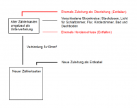 Der alte Zählerkasten wurde wegen der dort verteilten Anschlüsse nun "rückwärts" als Unterverteilung weiter betrieben. Von dort wurde z.B. der Herd der Küche versorgt. Im laufe der Jahre wurde auch der Herd auf den neuen Zählerkasten umgeklemmt. Eine Neuverlegung der Verbindungsleitung würde viele Probleme machen. Netzform TN-C-S.