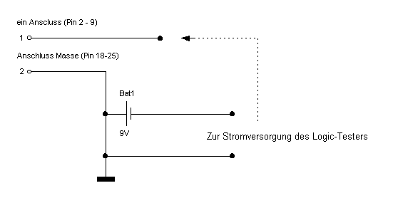 Minuspol der Batterie mit den Masseleitungen 18-25 und dem Minus-Anscluss des Logic-Testers zusammen, und der Plusanschluss des Logic-Tester an +9V der Batterie.
