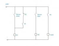 Wenn der untere Sensor ein Signal gibt soll sich ein magnetisches Wegeventil (24V DC, 5W)öffnen und solange geöffnet bleiben, bis der obere Sensor ein Signal gibt und wieder schließen.