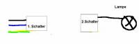 hi, also im prinzip kommen die 3 drähte aus einer unterputzdose in der 1. Etage raus, und dann gehen 3 andere drähte der gleichen farben auf den dachboden.Dort wo díe unterputzdose ist, sollte der 1. schalter hin. und oben der 2. schalter.Dieser ist aber noch nicht mit dem 1. schalter verbunden.