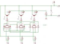 Hi. Mit dieser Schaltung leuchtet immer nur eine LED. Wenn du mit deinem Finger den Pad 1 berührst, leuchtet LED 1, bei Pad 2 LED 2 und bei Pad 3 LED 3. Du brauchst nur einen 4011, 10 Widerstände, 3 Dioden und 3 Transistoren.