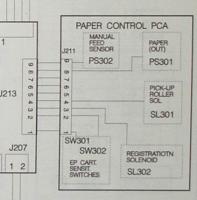 anbei sende ich Dir zwei Auszüge aus dem Schaltplan, die Dir helfen sollten, das Problem zu lösen. Meiner Meinung nach sollte der Fehler im Bereich der beiden Schalter SW 301 und 302 zu finden sein, die das Vorhandensein der Cartridge erkennen. Es müßte sich dabei um die beiden Mikroschalter oben links auf der Platine handeln, welche beide von oben über zwei metallene Laschen betätigt werden. Hoffe, es bringt Dich weiter!