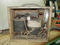 Das innere des Holzgehäuses, in dem der Trafo drinsitzt, sieht recht abenteuerlich aus.