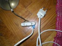 Das Ding is ein italienischer Schnurschalter aus dem jahre Schnee, und der Aufbau war eine selbstgebastelte Tischleuchte. Grundlagen: Ein Kerzenleuchter aus Messing. Ein Stück Messingrohr. Und alles was dem Typen so an elektrotechnischem Schrott in die Finger geraten ist. Das Rohr wurde dort wo normalerweise die Kerze sitzt in den Halter gelötet, darauf kam eine Isolierstoff-Lampenfassung, schwarz. Damit die nicht so häßlich ist eine simple weiße Papiermanschette drum Die hat mit der Zeit so eine pergamentartige bräunlich Färbung entwickelt... edel! *grusel* Leitungsführung durch ein seitlich in das Rohr gebohrtes Loch und scharf um die Kurve in die Fassung. Mistiger Eurostecker, flache Mantelleitung, Schnurschalter, braune Zwillingsleitung zur Lampe. Die Ns waren im Schalter verzwirbelt und mit Isolierband umwickelt, und IIRC gingen von allen(!) Verbindungsstellen im Schalter (also L geschaltet, L und N) abgezwickte Drahtenden weg.