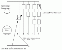 Etwas früher hat dir Joda einen Schaltplan gezeichnet, allerding mit Dioden. wenn du anstatt den dioden(Diode= Dreieck und Querstrich) ein rechteck zeichnest dann ist das die aller einfachste und billigste lösung. wenn joda also 4Dreiecke mit Querstricherln hintereinander gezeichnet hat dann ist das eine Serienschaltung. D.h. alle senkrechten Lienien sind in serie liegende Dioden bzw. keine diode bei stufe 5. d.h.: wenn du einen schalter kaufst mit dem du keine, eine,zwei.... Dioden oder Wiederstände zwischen den +Pol und den Motor schaltest und Minus mit dem anderen Pol des Motors verbindest, dann bist du schon fertig.