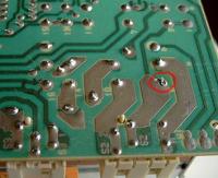 Zu den Bildern: Der defekte Widerstand liegt am unteren Rand, den Ersatzwiderstand bildete ich aus 2x 220 Ohm parallel, da ein Lötauge und ein Stück leiterbahn beschädigt waren, habe ich den Anschlußdraht etwas weiter rum auf der Leiterbahn verlötet. Im test mit feuchter Wäsche lag der Widerstand zwischen Abnehmer und Erde bei 170 Ohm.