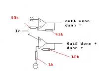ich will dass wenn ich an einen eingang negative Spannung habe am ausgang 1 positive ist(wenn nix am eingang ist soll an beiden masse sein).Und wenn positive am eingang ist, am ausgang 2 positive ausgangspannung ist.