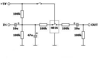 Eine weitere Möglichkeit bestünde darin, das zu schaltende Audio Signal auf sagen wir 2.5V anzuheben und den IC norma mit 5V gegen Masse zu versorgen. Bin allerdings noch zu unerfahren und hab keinen Plan wie ich die Gleichspannung vom Signal wieder entferne (mit einem Kondensator?) deshalb würde ich die erstgenannte Methode vorziehen.
