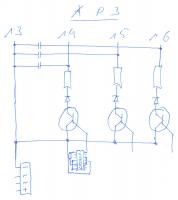 Auf der Platine sind die Anschlüsse 14 15 16 des Steckers XP3 für die Zündung zuständig. Jeder dieser Pins ist zunächst über einen MKT mit Pin 13 verbunden, der durch XT12 auf die Anode von V01 gelegt ist. Dann folgen je ein Widerstand, eine Diode und ein Transistor. Die Transistoren schalten also den Impuls, bekommen ihren Saft von einem kleinen Brückengleichrichterleichrichter....