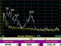 Man erkennt zwei Linien: die gelbe, tiefere Linie ist die "Referenzlinie", sie repräsentiert den Pumpenbetrieb in der kleinsten Leistungsstufe, wenn KEINE sirrenden Geräusche auftreten (siehe oben Audio-Datei ab Sekunde 40)