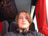 die Umgebung ist ein Bus und Du trägst einen geschlossenen Stereo-Kopfhörer.