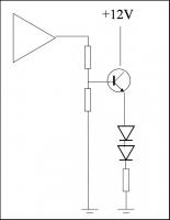 Die Schaltung mit den LEDs auf deiner Skizze ist im Gegensatz zu der Schaltung aus dem Link eine Kollektorschaltung. Deshalb ist die Spannung am "Verbraucher" (also der Reihenschaltung aus den 2 LEDs und dem Widerstand) immer um etwa 0,7 V (die Basis-Emitter-Spannung des Transistors) kleiner als die Steuerspannung an der Basis. Im vorliegenden Fall schwankt sie also etwa zwischen 3,3 V und 7,3 V. An der unteren Grenze ist sie klein genug, daß die LEDs erloschen sind. Evtl. kann man an dem Vorwiderstand der LEDs noch etwas spielen, um den Strom zu erhöhen, da bei dieser Schaltung eben nicht 12 V, sondern 7,3 V als maximal anliegende Spannung zu veranschlagen sind.