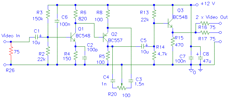 3) Wie hoch sollte man die Gesamtverstärkung wählen, um die Schaltung optimal als Überspiel/Anpassverstärker betreiben zu können (sprich in welchem Bereich wird sich der Videopegel eines Eingangssignals bewegen. Gab es unterschiedliche 'Norm'-Pegel für unterschiedliche Steckverbindungen wie DIN AV, Chinch, Scart etc)? - Wie könnte eine Verstärkungsregelung aussehen? Schaltung auf die maximale Verstärkung auslegen und Poti als Spannungsteiler in den Eingang (anstelle des rot markierten 75 Ohm Widerstandes R26, der von mir jetzt ergänzt wurde, aberin der Originalschaltung fehlt)? Poti anstelle von R6 (verändert aber den DC Pegel für Q2)? Poti mit großem C in Serie, Parallel zu einem großen R6 (sodass der Widerstand des Poti nur für AC wirksam wird)? Oder durch ein Poti an Stelle von R16 bzw R17 im Ausgang, was zwar jeden Ausgang einzeln regelbar machen würde, aber vielleicht zu Problemen wegen Fehlanpassung führen könnte?