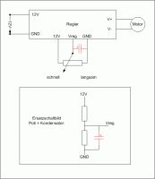 Randbemerkungen: den Elko kann ich sowohl polverkehrt als auch an "langsam" bzw. "schnell" Pol des Poti anschliessen, funz trotzdem. Gegenprobe gemacht: ohne Elko rennt der Motor sofort los, mit Elko wunderbar sanft und feinfühlig.