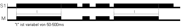 Löst man den Schalter schon vor Ablauf der Zeit „t“ geht der Motor auch aus. Ein schnelles triggern hintereinander hat keinen Einfluss auf die Schaltung und der Motor geht jedes mal an und aus.