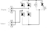 Die Umschalterei kann man weglassen (Thyristor, Z-Diode, Elko). Was dann überbleibt, ist die Verbindungsanzeige bestehend aus dem Gleichrichter mit 150 Ohm Widerstand parallel zur Led.