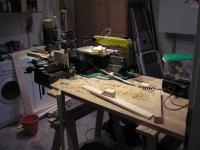 Rechts davon, in bequemer Steh-Höhe ein weiterer Tisch mit Fräse usw. drauf.
