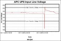 Einmal bei einem plötzlichen Gewitter, wo ich mich erschrocken hatte, als der Fernseher auf einmal aus war und die USV kurz gebrummt hatte (das Teil brummt, wenn es auf Batteriestrom ist ). Das zweite Mal war die Panne bei dem Energieversorger, wo in halb Europa der Strom weg war. Bei mir hat nur das Licht geflackert und die USV hat auf Batteriestrom geschaltet und meine Mutter hat rumgemeckert, da der Digitalreciever im Wohnzimmer bei jeder Schwankung neu gestartet hat. (Hab mal eine Spannungsanalyse meiner USV-Software als Bild beigefügt.)