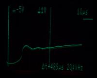 Das nächste Bild zeigt die Elkospannung. Nachdem die Lichtbogenentladung eingesetzt hat, scheint der Strom ziemlich konstant zu sein. Der IGBT arbeitet anscheinend als Konstantstromquelle. Ein ähnliches Verhalten zeigt auch das Datenblatt, dass einen sehr rapiden Knick in der Kennlinie der CE Spannung zeigt, wenn der Strom hoch wird. Dieses Verhalten erklärt auch die CE Spannung: Der IGBT verheizt die Differenz zwischen Elkospannung und etwa 170V Brennspannung der Blitzröhre.