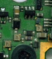 Links die Koaxbuchse für eine externe Antenne. Beim Bauteil mit der Aufschrift L25TK2 und dem ähnlichen weiter rechts handelt es sich um koaxiale Bandfilter, vermutlich als Bestandteile der Sende/Empfangs-Diplexer.