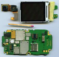 Links oben die flexible Leiterplatte mit den beiden Kameras dieses Klapphandys. Eine schaut nach vorn, dem Benutzer ins Gesicht, die andere in die Gegend. Von ihr sieht man nur den rückwärtigen Deckel. Diese Kameras sind nämlich, um Bauhöhe zu sparen, durch die Folie durchgesteckt.