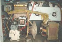 im ersten Bild ist an dem rechten Trafo ein Bimetall-Schalter erkennbar. Ist der geschlossen? Rechts oberhalb des Schützes sitzt ein Steuertrafo (?) - sind die Wicklungen ok (Ohmwert)? Die beiden Sicherungen auf der Platine hast du geprüft? Kannst du ein Bild von der dem Foto 1 gegenüberliegenden Geräteseite machen?