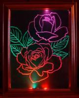 Dann hab ich die Scheiben mit der glatten Seite nach von in die Rahmen gesetzt, die LEDs mit Heißkleber fixiert, verlötet (bei den Rosen: die beiden roten in Reihe und mit der grünen und pink parallel; bei der Massai, jeweils 3 in Reihe) und an das Netzteil angeschlossen.