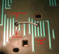 Nun habe ich einfach mal eine Leiterbahn getrennt und an die Schmitt-Trigger-Seite eine Überbrückung an +5V gelötet.