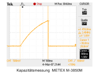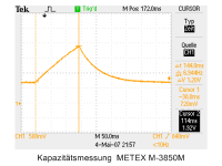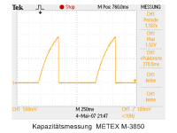 | | Mein DMM oszilliert. Am Oszilloskop sieht man eine Dreieckspannung zwischen 0,5 und 1 Volt. Die Kapazität wird wohl über die Periodendauer gemessen. |