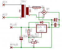 Im Netzteilschaltplan ist die Diode über dem LM 317 verpolt eingezeichnet und setzt den Regler außer Betrieb.
