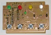 Das Teil besteht aus 4 farbigen LEDs (grün,rot,gelb,blau) und 4 OMRON-Tastern und einem Piezo-LS. Es hat keinen EIN-/AUS-Schalter weil ich den Sleep-Mode des PIC bemüht habe; das Gerät wird einfach durch einen beliebigen Tastendruck aufgeweckt. Stromverbrauch im Sleep-Mode weniger als 1µA und es läuft daher mit 3 Billigknopfzellen AG13 für die ich sogar halbwegs vernünftige Halterungen gefunden habe. (Sucht mal nach einem Halter für 3 Knopfzellen )