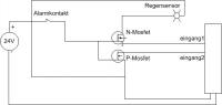 mosfets 1 unterbricht bei alarm (gatespannung über alarmkontakt unterbrochen) den kontakt des regensensors an eingang 1 ,und mosfet 2 schalten 24V auf den eingang 2