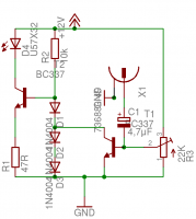 Eigentlich wollte ich nur als kleine Einstimmung auf ein anderes Laser-Projekt ein bissel Musik über nen Laser übertragen. Dazu habe ich eine kleine begrenzte invertierende Spannungsgesteuerte Stromquelle unterster Qualitätsstufe gebaut (Siehe Schaltplan).