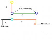 Nun mein Problem: Ich kann zwar die im Bild eingezeichneten Leitung A,B,C gegen ein neues Kabel tauschen, aber die Leitung D ist eine 1,5 q/mm Zuleitung zur Lampe die ich nicht tauschen kann.