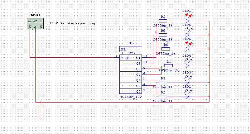 Wollte mir ne simple schaltung bauen... hab nen Schaltplan entwickelt und ihn mit Multisim simuliert, im Ideal Modus läuft auch alles so wie ich es mir vorstelle.. aber wenn ich Real Modus einstelle.. funktioniert es nicht.. die Roten Leds fangen an unkoordiniert rumzublinken.