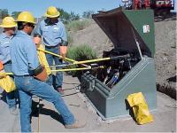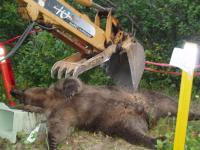 In Amiland gibt es auch kleine Kabelverteiler an denen die Mittelspannung verteilt wird . Da kannst Du dann mit den sogenannten Hot-Sticks , also einer Schaltstange Schalthandlungen vornehmen . Vielleicht war das so ein Teil . Und genauso wie es bei den Amis kleine Masttrafos gibt mit wenig kvA die nur ein oder 2 Häuser versorgen , gibts das auch unterirdisch . Da hast Du dann im Garten hinterm Haus einen komplett oder teilversenkten Kunststoffkasten in dem sich ein kleiner Trafo der nur Dein Haus versorgt , befindet . Und so einen kleinen miesen Kasten wird der Bär geöffnet haben . Wer weiss , vielleicht hatten sich Bienen in dem Kasten angesiedelt und er hat den Honig gerochen und hat das mit dem leben bezahlt . Warum sonst sollte der Bär den Kasten aufbrechen und in ein Kabel beissen . Oder der Bär war ganz einfach ein bisschen dämlich ?!? Ach ja falls jemand Fotos hat von solchen amerikanischen Miniaturtrafostationen die unterirdisch verbaut sind , dann bitte hier posten .