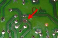 Nach Ausbau aus der Maschine sah ich in dem umgebenden Plastikgehäuse eine Schmorstelle und auf der Platine einen Kontakt welcher (vermutlich vorher eine kalte Lötstelle) ohne Lötzinn keinen Kontakt mehr zur Leiterbahn hatte.