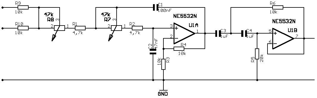 Die beiden Potis sind ein logarithmisches Stereopoti und erlauben eine einstellbare Frequenz des Tiefpaßfilters (50-500Hz). Der rechte Teil ist ein Hochpaß von etwa 10Hz zum Schutz der Lautsprecher.