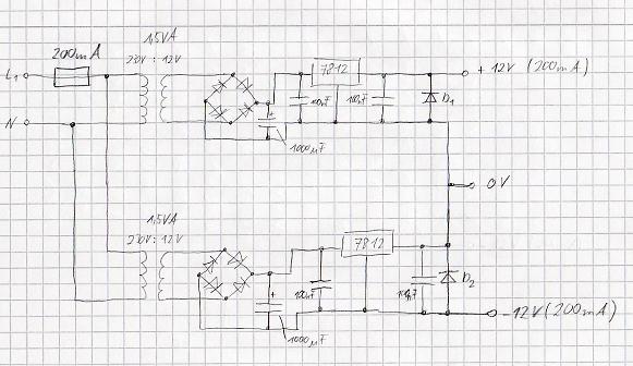 Zwischen deinen +12V und -12V sind nunmal 24V Unterschied. Daher kommst du mit 15V nicht aus. Die Schaltung von Racingsascha hat keine zwei Trafos, da ist nur einer drin mit Mittenanzapfung. Das ist die übliche Schaltung wenn man derartige Spannungen benötigt, ob dir das nun gefällt oder nicht
