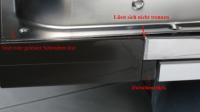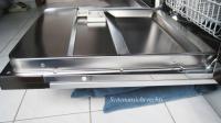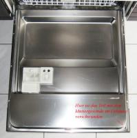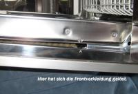 Ich habe versucht, die Vorderfrontverkleidung abzunehmen, bin dabei aber nicht weitergekommen: Rechts und links sind je 4 Schrauben, davon habe ich zunächst die jeweils unteren drei entfernt. Die Verkleidung löste sich unten etwa 2 cm, ist aber oben offenbar auch mit der Frontblende verbunden. Daraufhin habe ich auch die oberen Schrauben gelöst, jedoch ohne Erfolg. Nach Herausdrehen der rechten Schraube (in Blickrichtung auf den Spüler) hörte ich ein metallisches Geräusch, als ob das Gewinde-Gegenstück der Schraube nach innen abgefallen sei. Die Schraube ließ sich daraufhin ohne Widerstand in die vorgesehene Bohrung stecken, was meine Vermutung zu bestätigen scheint.