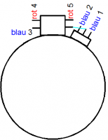 (5 Kabel (wilkürlich numeriert), 2 Kontakte sind direkt verbunden (türkis))
