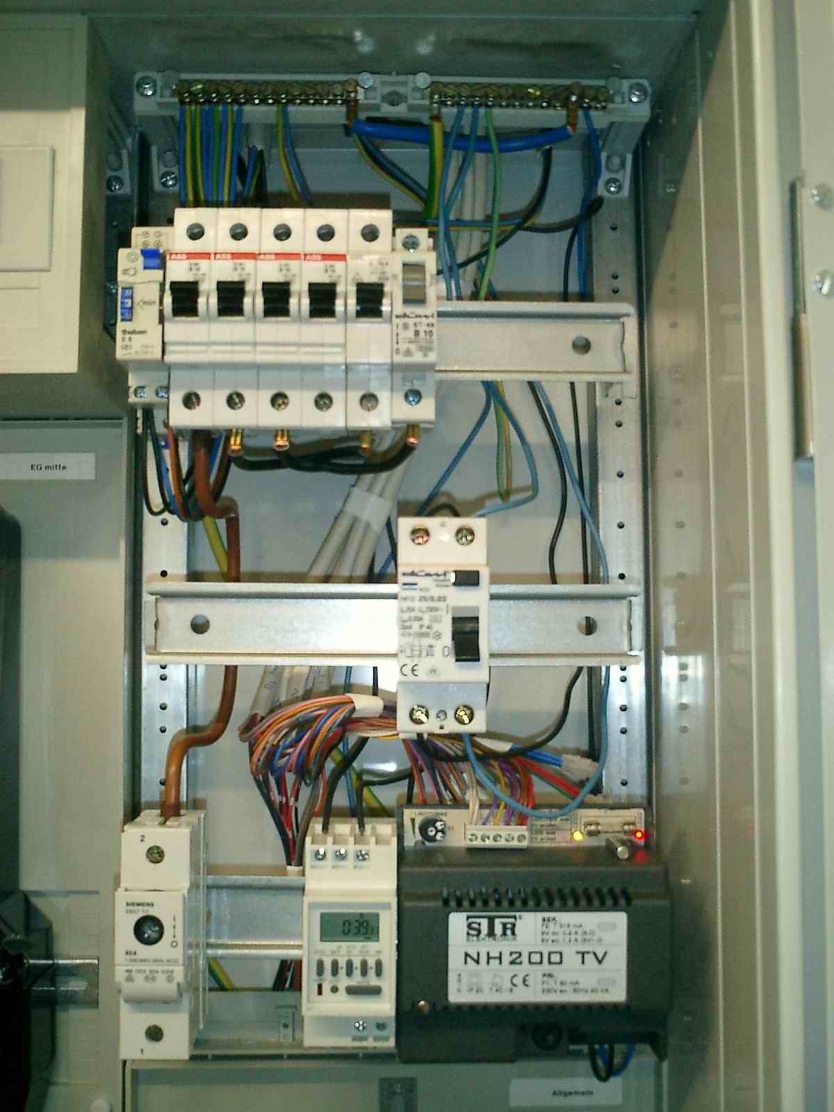 Die Verdrahtung für die Phase ist von der Vorsicherung 63 A zum Automaten 10 A zum FI 30 mA zur Lampe.