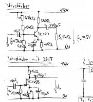 Ich hab jetzt mal zwei Verstärkerschaltungen aus meinem alten Schaltungs-Sammelsurium eingescannt, eine mit bipolarem Transistor (BC107) und eine mit JFET (BF245). Die Schaltung mit dem BC107 hab ich mal getestet, die funktioniert. Die andere habe ich noch nicht getestet, da ich damals noch über eine 30V-Spannungsquelle verfügte