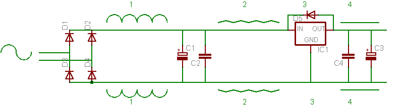 Am Eingang jeder Netzspannungsquelle steht nur eine Sinusspannung zur verfügung. Die Dioden am Eingang lassen da nur die positiven und negativen Halbwellen durch (1). An C1 wird diese Spannung nun "etwas" geglättet (2) um danach im Regler (IC1) auf die gewünschte Ausgangsspannung geregelt zu werden. Dabei gibt es noch einen nützlichen Nebeneffekt, die Elektronische Siebung (3). Diese Spannung wird nun im Ladekondensator "gepuffert" und steht als Gleichspannung zur verfügung (4).